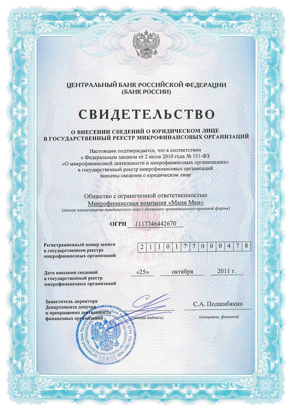 - ООО МФК "Мани Мен":121096, г. Москва, ул. Василисы Кожиной, д.1, офис Д13 ОГРН: 1117746442670, Лицензия;